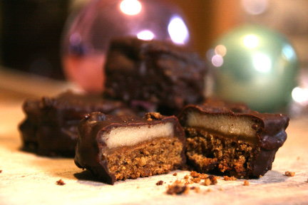 Alles auf einem Backblech (mit Backpapier ausgelegt oder gefettet und mit Mehl bestäubt) ca. 0,5 cm dick ausrollen. Bei 160 °C ca. 10 – 15 Minuten backen, bis die Ränder leicht gebräunt sind (Dauer kann je nach Backofen variieren). Noch warm in kleine Quadrate schneiden und abkühlen lassen.
